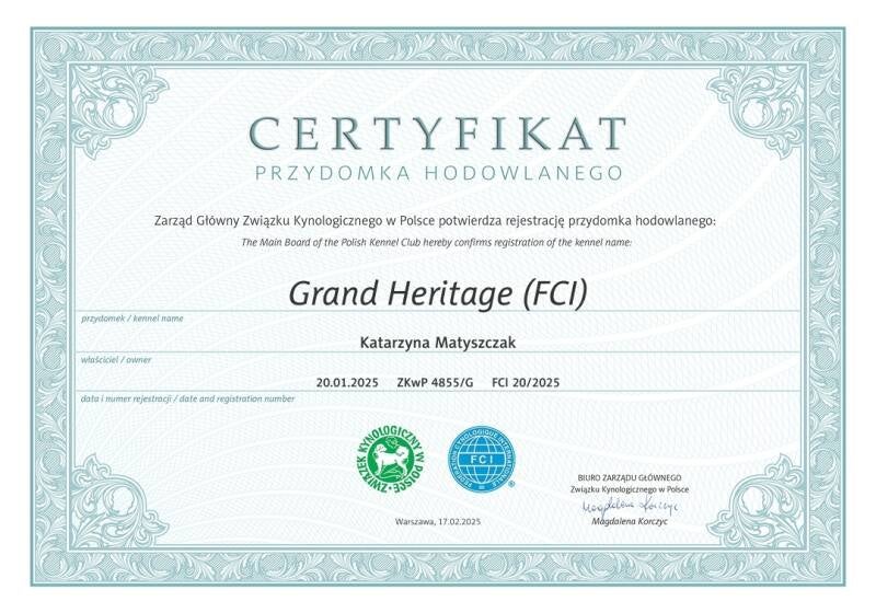 Każdy miot w Grand Heritage to decyzja przemyślana, oparta na zdrowiu, charakterze i predyspozycjach psychicznych rodziców.